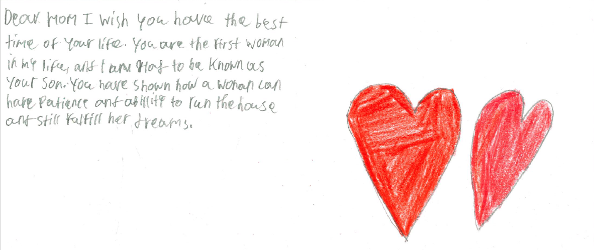 “Dear Mom I wish you have the best time in your life. You are the first woman in my life, and I am [proud] to be known as your son. You have shown how a woman can have patience and ability to run the house and still fulfill her dreams.”